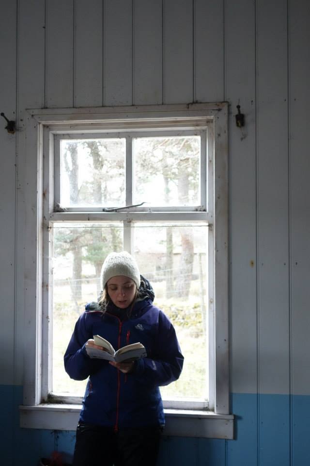 Reading The Living Mountain during a workshop back in 2013 at abandoned Blackwater Lodge, Cabrach. NE Scotland.